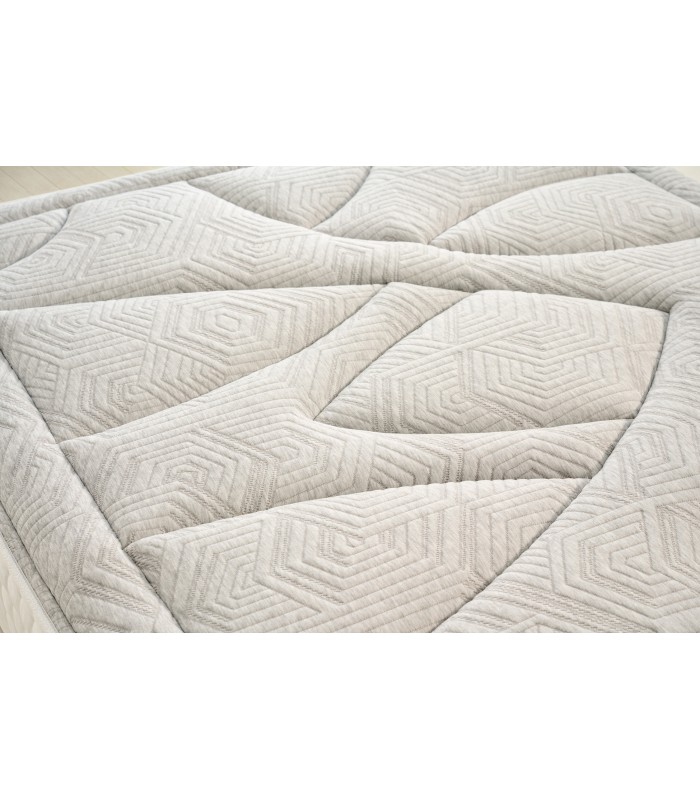 Además, sus muelles ensacados independientes proporcionan una adaptabilidad punto por punto al contorno del cuerpo, una correcta ventilación interna y una independencia total de lechos, asegurando un soporte firme y estable en toda la superficie. Sobre esta base se incorpora una capa de 2 cm de viscoelástica, que mejora la acogida del cuerpo, reduce los puntos de presión y favorece una postura ergonómicamente correcta durante el descanso.