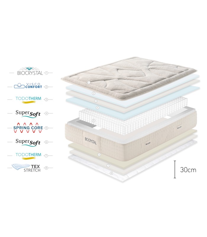 El colchón Biocrystal Gold Spring está diseñado con una estructura avanzada que combina confort ergonómico y tecnologías de bienestar.